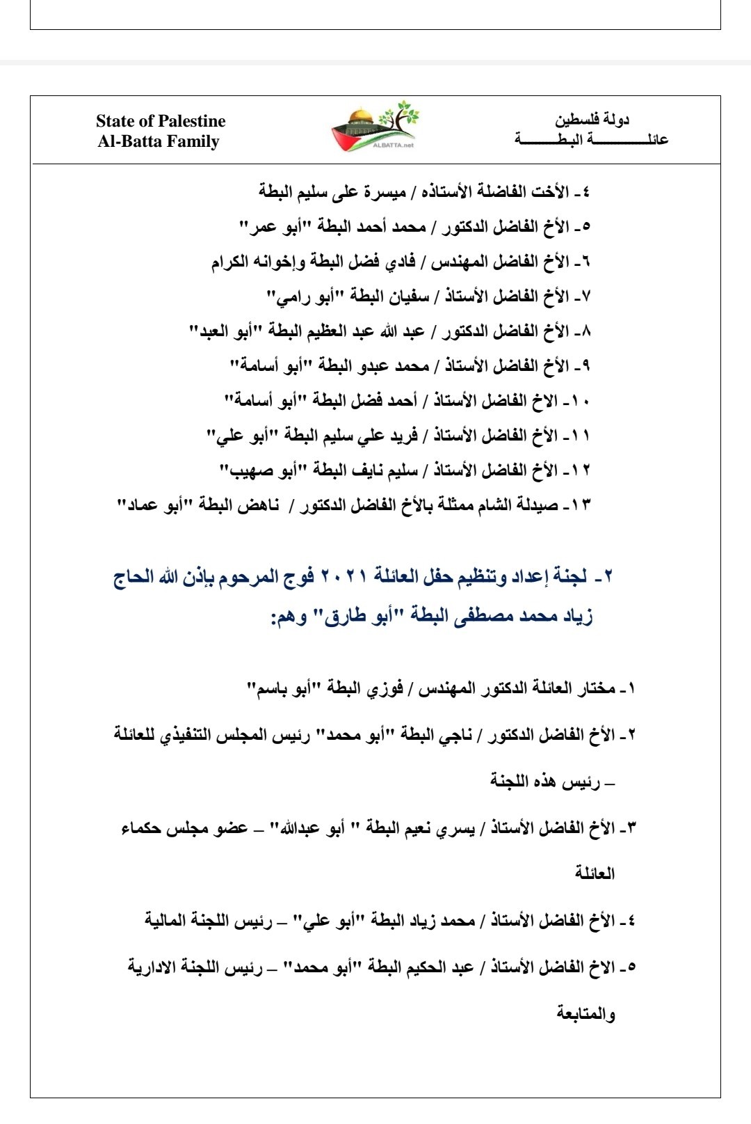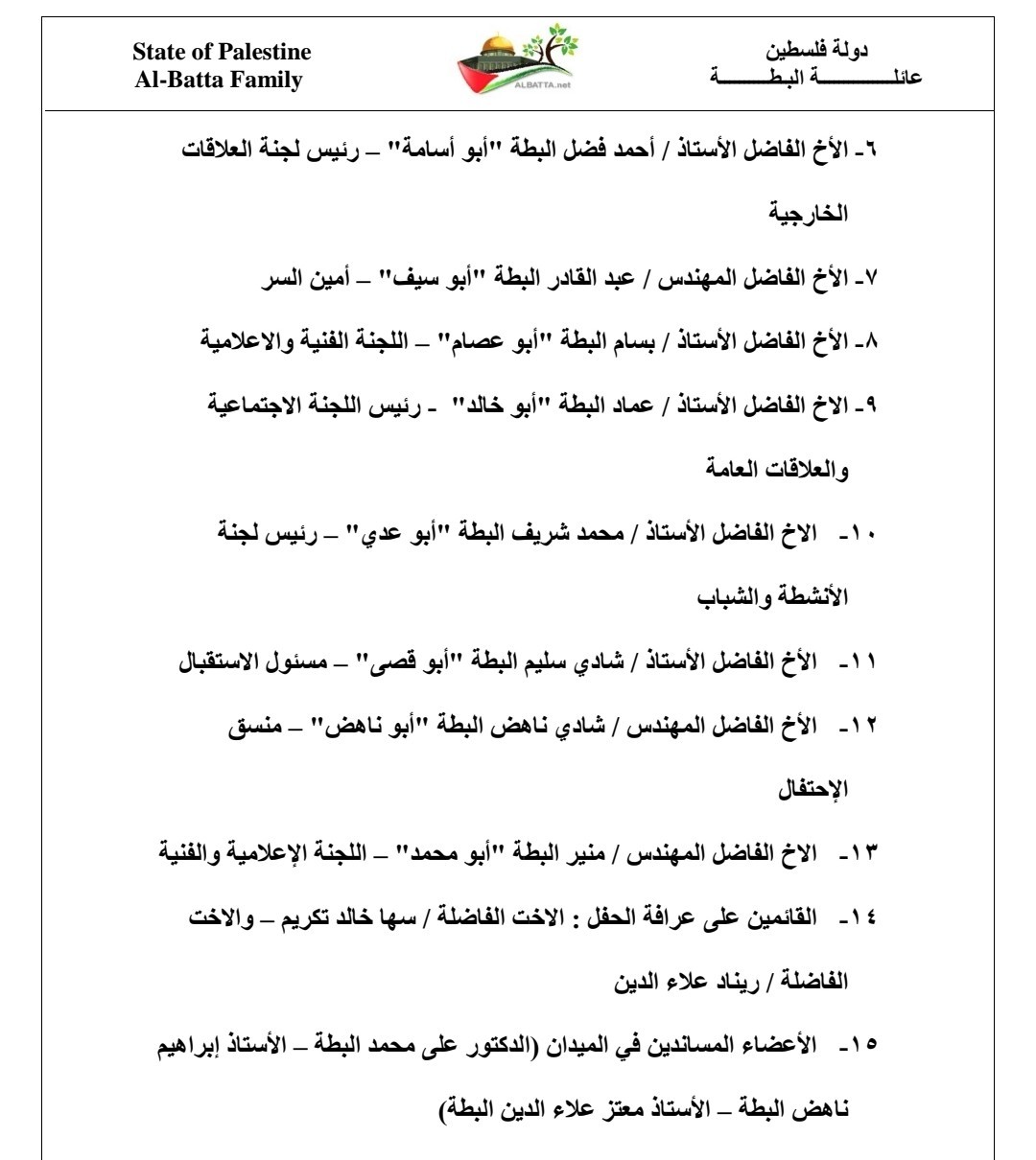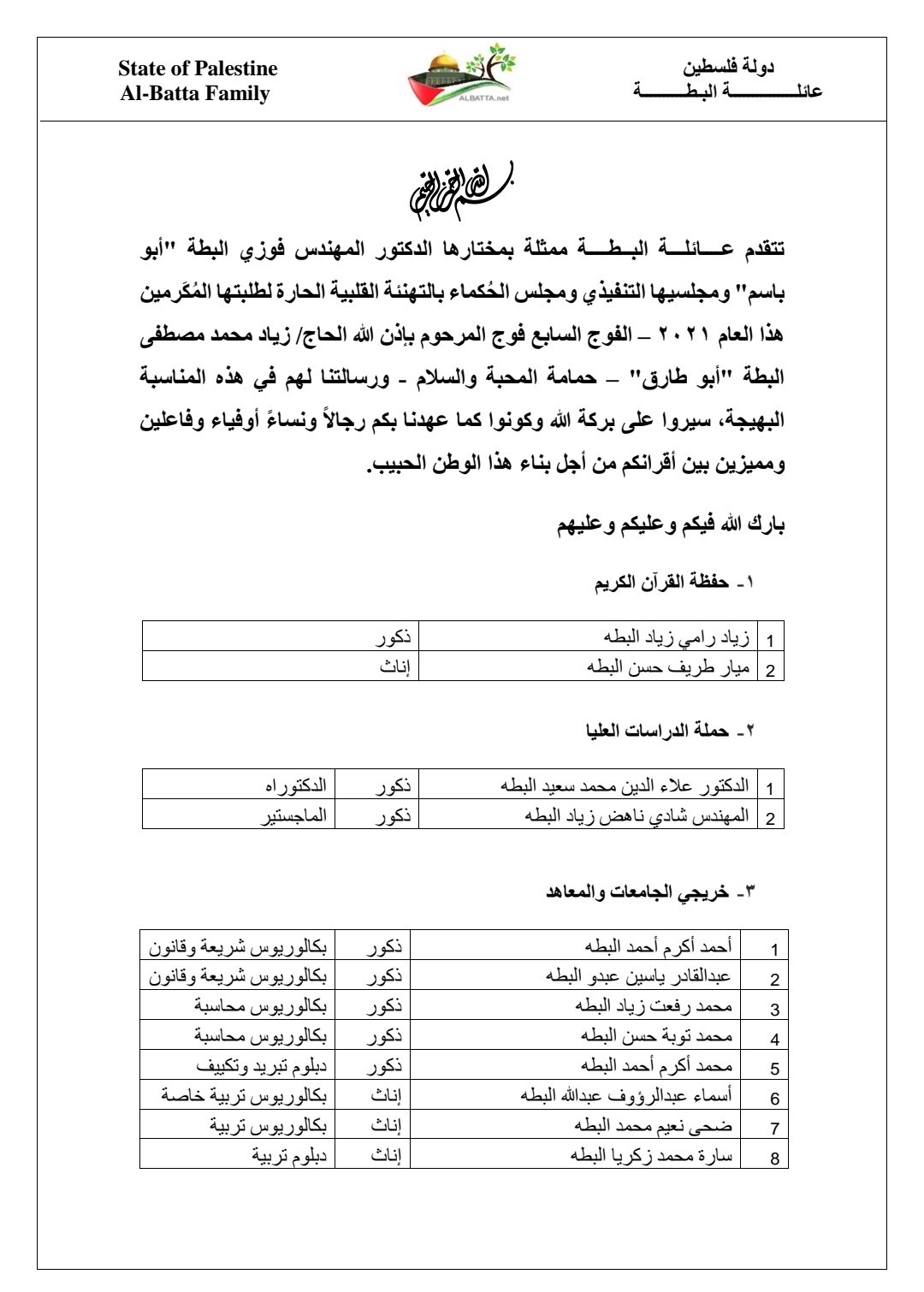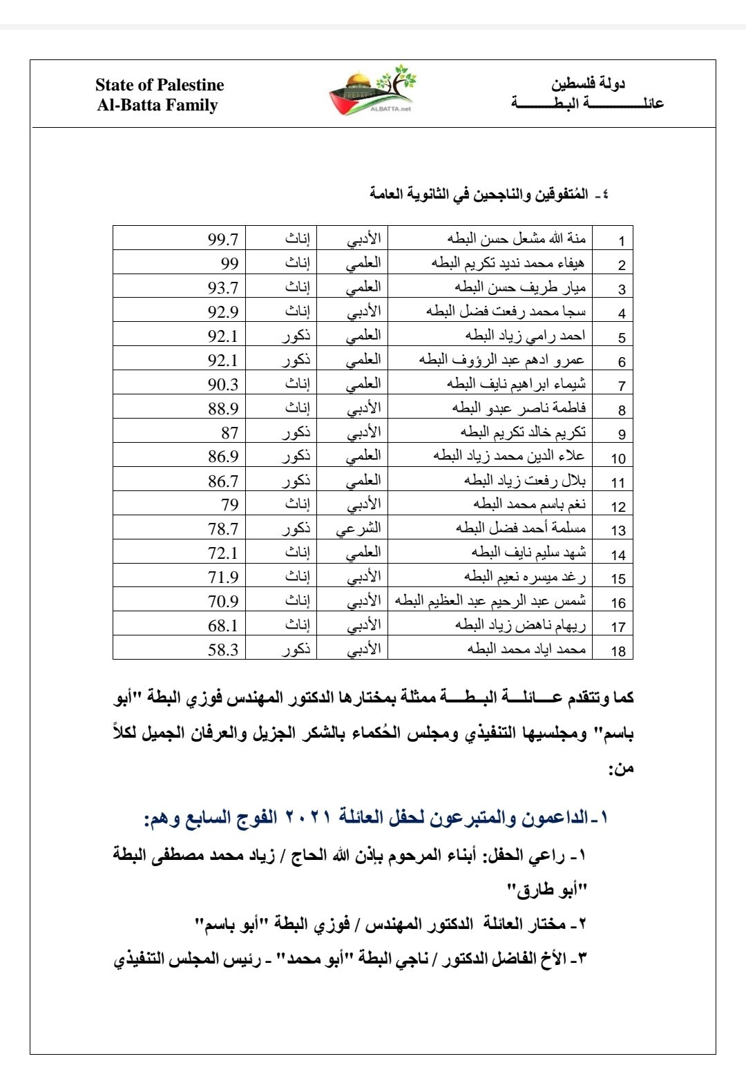 شكر العارفين بما قمتم به.والمجهود الذي بذلتم لإدخال الفرحة والبهجة والسرور الى قلوب ابناء عائلتكم في حفل تتويج حفظة كتاب الله و تكريم حملة الدراسات العليا وخريجي الجامعات والمتفوقين الناجحين في الثانوية العامة توجيهي 2021م