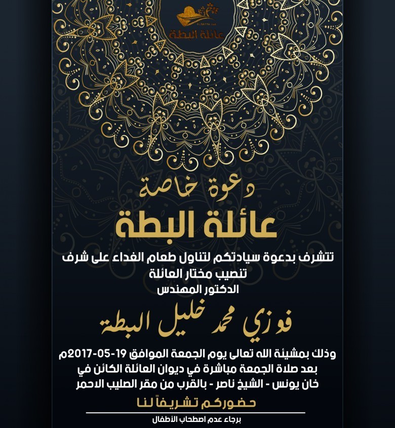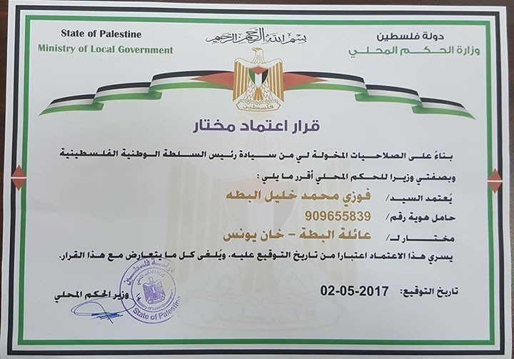 و ذلك بعد أن تم إنتخاب المختارعبر إنتخابات عائلة شارك بها أبناء العائلة الكرام حملة الهوية عبر صندوق اﻹقتراع في ديوان العائلة ،و بناء على ذلك في يوم الأربعاء الموافق م03.05.2017 ، تم تسليم الختم من وزير الحكم المحلي المهندس رفيق مكي ،ووكيل الوزارة م. سفيان أبو سمره، وتأتي عملية تنصيب أي مختار في العائلة على أساس شرط الإنتخابات الدورية بعد مضي أربع سنوات و يحق للمختار السابق ترشيح نفسه مره أخرى مع المرشحين الجدد، وذلك حسب بنود ميثاق عائلة البطة المتفق عليه مع مجلس حكماء العائلة و المجلس التنفذي العائلي.